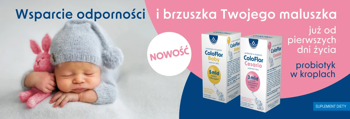 Coloflor Cesario to probiotyk dla dzieci po cesarskim cięciu, który wspiera rozwój prawidłowej flory bakteryjnej noworodka. Znajdują się w nim szczepy bakterii bytujących w mleku i drogach rodnych matki, takie jak Lactobacillus rhamnosus GG (ATCC 53103), Bifidobacterium infantis (BIO 5478) i Lactobacillus fermentum (CECT 5716). Probiotyk po cesarskim cięciu zaopatruje florę jelitową noworodka w bakterie, które towarzyszą naturalnemu porodowi. Z kolei Coloflor Baby to uniwersalny probiotyk w kroplach dla dzieci, niemowląt i noworodków, który zawiera żywe kultury bakterii Lactobacillus rhamnosus GG (ATCC 53103)1. Oba preparaty są przeznaczone dla dzieci od 1. dnia życia.